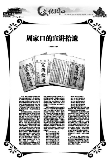 在那个时代,周家口和其他地区一样,群众自发地通过宣讲拾遗,进行自我教育,填补了官府的教育空白,在社会上无疑起到了良好的教育作用。这项活动,从明朝开始,经过清朝,直到1944年日寇攻入周家口才算终止。