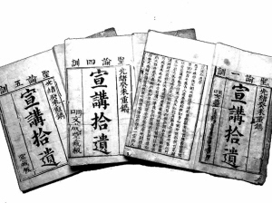 宣讲拾遗是过去社会上群众进行自我道德教育的一种方式。据介绍,它起源于明末,盛行于清代。那时,群众看不到报纸、电视,听不到广播,也没有公园和商店可逛,文化生活非常贫乏,于是,有文化的人傍晚便坐在家门前与人聊天、讲故事,让大家在欢声笑语中受到启发教育。到了清代,聚在一起休闲的人越来越多,举人、秀才们便自发组织起来为群众宣讲道德故事。他们收集社会上积德行善、教子成名及大逆不孝、打骂公婆等好坏典型事例,经过艺术加工,编成唱词,加上道白,印刷成册,取名为《宣讲拾遗》,并公开发行。宣讲者每到傍晚便在背街十字路口或空地上,搭起一个两米多高的架子,上面放一个案几,两旁悬挂旗子,上书“宣讲拾遗”或“觉世劝民”,案几上放着一盏纸罩子油灯,宣讲者站在凳子上看着案上的书照本宣科。台下有两三人作准备,讲一个故事换一个人,他们不收取任何费用,完全是慈善行为。由于群众对皇帝无限忠诚,视皇帝话语为谕旨,宣讲者便以此对群众进行教育,不断引用皇帝的话语,因此群众也把这种活动叫作“讲圣谕”。再者,群众有根深蒂固的迷信思想,相信阴曹地府有十殿阎君和牛鬼蛇神等,在阳间作了恶,到了阴间就要上刀山下油锅等,宣讲者也以此教育群众。