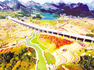 金秋时节,广西河池市南丹县巴平村梯田遍地金黄,五色鲜花点缀其间,美不胜收。