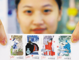 当日,中国邮政发行《中华孝道(二)》特种邮票1套4枚,图案内容分别为“百里负米”“亲尝汤药”“文姬续书”和“恺之画母”,全套邮票面值5.40元。新华社发(王齐胜 摄)