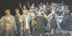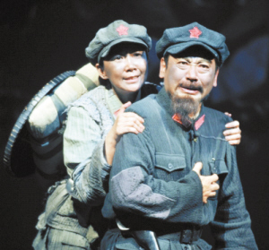当晚,演员刘劲、梅丽萍、赵旭、刘大为、曾永醍等同台献技,为观众塑造了一群鲜活的舞台形象(左图)。剧中既有毛泽东、周恩来、张闻天、王稼祥、朱德、博古、李德等领袖人物群体,也有红军指战员群体,如被俘后绞断肠子英勇牺牲的红军师长,年轻美丽充满梦想的红军女战士,一度害怕想逃离队伍的农夫,强渡乌江时勇护浮桥壮烈牺牲的娃娃兵,黎平城中的德籍传教士,守望在家乡瑞金的老母亲等。