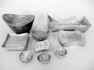 银锭上传达的信息非常重要,因市场上流通的元宝都是合金,含银量不同。如清朝北京有松江银,上海有二七宝银,长沙有用项银……全国约有100多种。后为方便流通,康熙时规定了作为单位的“虚两银”——纹银,纯度935.347%。。还需要说明的是,所谓“一两”在各地的重量也不同。通常而言,明清时一两银子重37.3克。