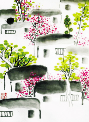 小村寂寂深静,狗吠一声两声。花开复又花落,山中掠过微风。
