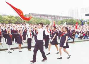 10月13日,少先队员在南宁市滨湖路小学举行出旗仪式。