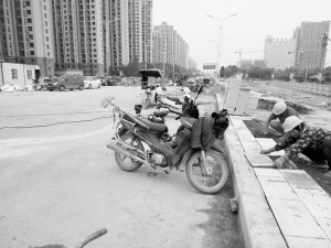10月14下午,周口晚报记者在互通立交施工现场看到,立交桥桥面周口大道部分路段已经铺上沥青(如图二),两侧正在安装护栏、铺设行道砖(如图三)。互通立交主体工程已经完工(如图四),工人们正在进行相关的配套建设。