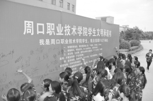 本报讯 昨日,周口晚报记者从周口职业技术学院了解到,新学期开始后,该校近万名在校大学生签订了《学生文明承诺书》。承诺书中包含十条学生守则,为学生们的校园生活指明了方向。