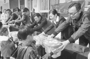 17日上午,在大张村小学,爱心人士把书包、文具和儿童药箱一一发给孩子们(如图)。