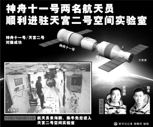 按照任务实施计划,两名航天员随后将从神舟十一号飞船进入天宫二号。