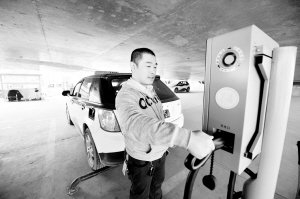 10月19日,在太原市并州路一电动车充电站,一位司机在为出租车充电。