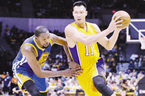 当日,湖人队球员易建联(右)与勇士队球员杜兰特拼抢。
