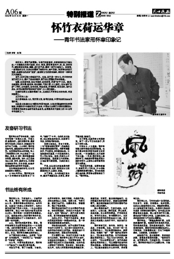 邢怀章出生于杏林世家。他的爷爷写得一手蝇头小楷,尺素之间,刚柔并济。幼时的邢怀章,最爱看爷爷给病人写药方,并逐渐对书法产生了兴趣。上小学时,邢怀章拿起毛笔,像模像样地学着爷爷写字。他按照继承祖业的安排,考上了河南医科大学,毕业后成了一名医生。但是,32岁时,邢怀章毅然解去青囊,重拾笔墨。如今,他已经成为以小楷、隶书、魏碑为长,又探索出创意性字体,五体皆擅,全能多面的全国著名的青年书法家。