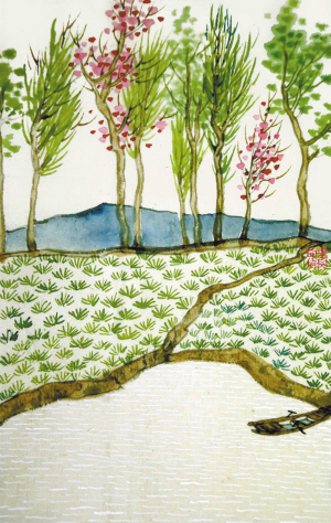 远处树叶新绿,麦田微风吹起。陌上有花开着,像你。