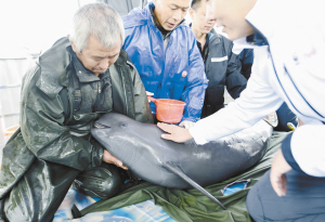 10月24日,在湖北长江天鹅洲白鱀豚国家级自然保护区,志愿者谢守军(左一)帮助工作人员为长江江豚“天天”进行体检。