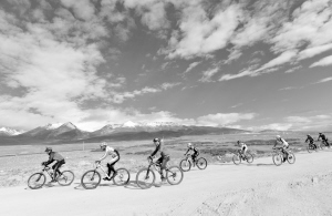 这是2016年10月3日,在西藏当雄县参加第14届中国西藏登山大会的选手们在雪古拉峰自行车越野挑战赛中。
