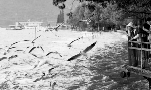 10月25日,人们在滇池之畔的昆明市海埂公园给前来越冬的红嘴鸥喂食。
