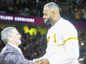 总冠军旗帜在骑士主场升起,这是克里夫兰这座城市52年来首个四大职业联赛冠军,同时骑士全队和教练组也在赛前接过了代表最高荣誉的总冠军戒指。