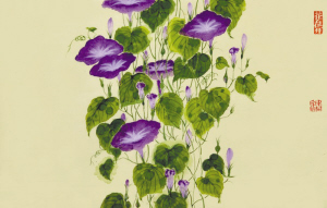 朝颜花开,篱上缠绵。临风弄碧,态度雅娴。