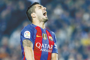 当地时间10月29日,巴塞罗那队球员苏亚雷斯在比赛中。当日,在2016~2017赛季西班牙足球甲级联赛第十轮的一场比赛中,坐镇主场的巴塞罗那队以1∶0战胜格拉纳达队。