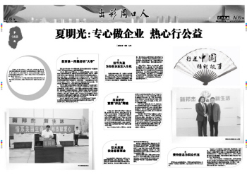 目前,身为周口市人大代表的夏明光在商海打拼的同时,积极投身社会公益事业,连续多年被评为周口慈善事业先进工作者。