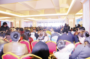 当天上午,位于周口市工农路与黄河路交会处近期投入使用的雁栖湖酒店门前广场,彩旗猎猎,气球高悬,处处洋溢着节日般的喜庆气氛。雁栖湖酒店二楼多功能厅更是装扮一新,多面产品广告墙和4个电子显示屏彰显出活动的隆重氛围。不到9时,800个座位已座无虚席,客户只好站在走廊里。现场气氛隆重、热烈、喜庆,会场秩序井然。