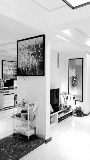 原本的大客厅被张利欢一分为二。考虑到平常工作比较忙,客厅的使用频率并不高,另外,在家里招待客人的时间并不多。于是,传统的客厅空间被大大压缩,电视机挂在墙上,节省了空间,再减去茶几,客厅缩短至原来的一半。