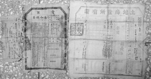 纸张泛黄的两张中,较小的一张是民国三十四年(1945年)的土地契税凭证,上面写的姓名是闫富清;另一张是民国三十五年的土地卖契凭证,姓名也是闫富清。这两张凭证都有些破损,总体上还算完整。