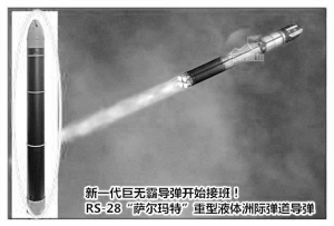 俄罗斯2009年开始研制新型重型液体燃料洲际导弹,以替换即将退役的R-36M2“部队长官”(北约称为SS-19“撒旦”)和UR-100N UTTH(北约称为SS-19“短剑”)导弹。根据目前公布的信息,“萨尔玛特”导弹自重100吨,采用液体燃料发动机,能携带10到15枚分导式核弹头。弹头采取先进的突防技术,据称能突破现有所有反导系统,可从不同方向对多个目标进行识别攻击。导弹射程达1.7万千米,可飞越南极或北极,精准攻击地球上任一目标。