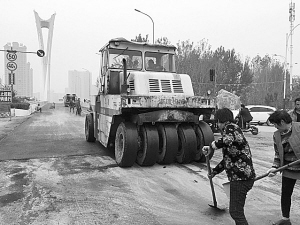 由于交通压力较大,并长期遭受大车碾压,市区大庆路桥桥面出现多处坑槽和破损。11月4日夜晚,中建七局连夜对该桥进行桥面维修。为降低施工对交通的影响,维修作业选择在夜间展开,施工人员对原有破损桥面进行表层铣刨后,重新铺装了一层沥青混凝土磨耗层。据了解,桥面维修作业于11月6日傍晚完成。晚报记者 彭慧 摄