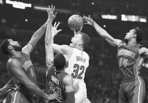 当日,快船队球员格里芬(右二)在比赛中上篮。