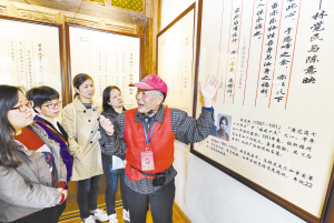 11月10日,福州市鼓楼区导游志愿者曾世康(右一)在“福州三坊七巷名人家风家训馆”为当地居民讲述三坊七巷名人家风家训故事。