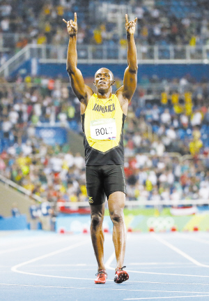 这是2016年8月18日,博尔特夺得里约奥运会田径男子200米冠军后庆祝。