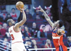 当地时间11月12日,公牛队球员韦德(左)在比赛中投篮。当日,在2016~2017赛季NBA常规赛中,芝加哥公牛队主场以106∶95战胜华盛顿奇才队。新华社发