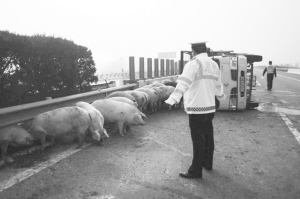 本报讯 11月12日下午,一辆载有30头猪的货车发生侧翻,猪在高速公路上乱窜。高速交警接到报警后迅速赶到现场,当起“赶猪倌”将猪赶上货车(如图)。