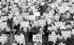当天,数十万韩国民众在首尔市中心举行大规模集会,要求朴槿惠总统对“亲信干政”事件负责并立即下台。韩国媒体说,这是2000年以来规模最大的一次集会。 组织者称,当天集会共有超过100万人参加。但据警方估计,实际参与民众约为26万人。新华社发