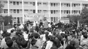 11月11日下午,周末公益剧场民族交响音乐进校园活动在许湾乡李灵希望小学举行, 周口民族管弦乐团的老师为该校600多名师生上了一节别开生面的音乐课,让孩子们近距离感受到交响乐的魅力。晚报记者 王晨 摄