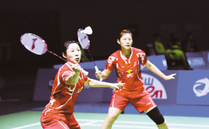 11月17日,骆赢/骆羽(左)在比赛中。当日,在福州举行的2016年中国羽毛球公开赛女双第二轮比赛中,中国选手骆赢/骆羽以2∶0战胜印尼选手德拉·哈里斯/罗西尔塔·萨里。