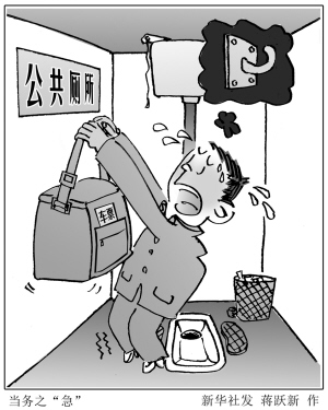 “痛点”首先是公共厕所总量少,结构不平衡。人们出门在外,经常走很久都找不到一间公厕,只好到快餐店里“蹭厕所”。对于女性来说,即使找到了公厕,在厕所外排长队也是常有的事,既尴尬又无奈。“痛点”还表现在很多厕所脏、乱、差。不久前,有的地方5A景区被国家旅游局摘牌,其中一个原因正是“厕所革命严重滞后”,存在异味严重、污水污迹多、长时间无人清扫等问题。另外,一些厕所细节之处不人性化。比如,有的厕所男女标识不明晰,容易混淆,尿急之时还得“烧脑”;很多厕所的格子间里,缺失一个小小的挂钩,让背包出行的人很不方便,等等。 新华社发