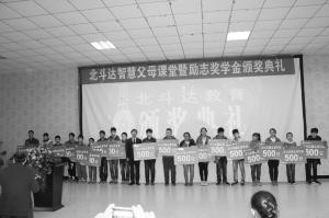 11月19日,北斗达教育智慧父母课堂暨励志奖学金颁奖典礼在大泽园酒店隆重举行,近千名学生和家长参加了此次活动。会上,校长单启航和大家一起交流、分享了孩子成长过程中家庭教育的重要性。优秀的孩子是社会教育、学校教育、家庭教育共同的结果,单校长希望在孩子成长的路上,形成家校教育合力,共筑孩子美好未来!此次活动共为优秀学子发放奖学金近6万元。图为单校长为学员颁发奖学金并合影。(记者 刘华志 摄)