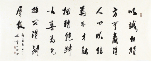 他的书法章法计白当黑,落落大方;结体内紧外放,优美雅观;笔法起伏跌宕,提按洒脱;墨法浓淡相宜,自然而然。通观其书法形式,大字下面配小字解释,颇有红花绿叶、烘云托月之效。因其书法独到,故被称为“童式书法”。