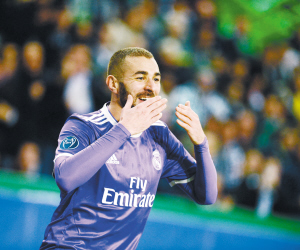 当地时间11月22日,皇马队球员本泽马庆祝进球。 当日,在2016~2017赛季欧洲足球冠军联赛F组比赛中,西甲皇家马德里队客场以2∶1战胜葡超里斯本竞技队。