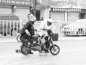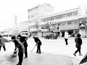 11月23日上午,大雪停止,道路结冰,郸城县中医院多名职工正在打扫医院门口道路上的积雪(图一)。这时,一名骑电动车的女子突然滑倒,在路中间执勤的交警急忙上前扶起(图二)。两个镜头合在一起,让人心中倍感温暖。晚报记者 徐松 摄