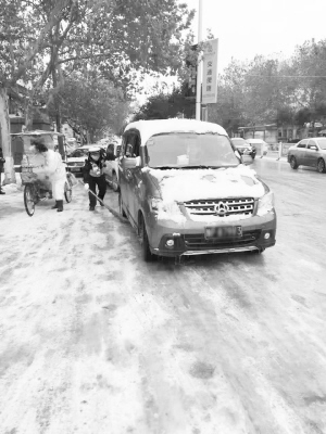 昨日,一场大雪过后,路面结冰,不少车辆打滑“趴窝”。在路上执勤的交警想尽各种办法帮助车辆驶离。图为一位交警用扫把帮助车辆驶离。晚报记者 朱东一 摄