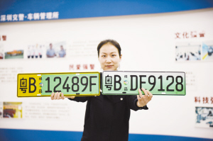 11月23日,深圳交警在展示新能源汽车号牌样品。