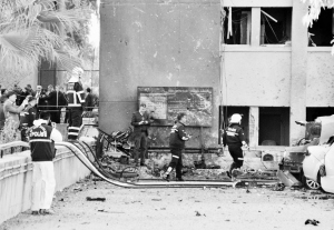 11月24日,在土耳其东南部阿达纳省政府办公楼停车场,消防人员和警察在爆炸现场工作。