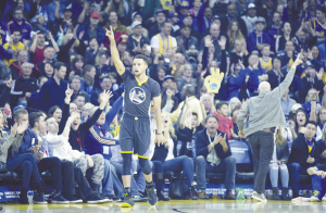 11月26日,勇士队球员库里庆祝投中三分球。