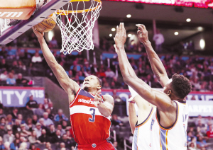 11月30日,奇才队球员布拉德利·比尔(左)在比赛中上篮。
