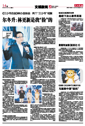 对于接下来的拍片计划,尔冬升坦言“很迷茫”。“2012年,我还没去横店学3D的时候,就老躺在家里,想之后怎么过日子,怎么拍电影。现在回想起来,其实我去横店连着拍了《我是路人甲》和《三少爷的剑》两部戏,是付出了很多热血的,这两部戏令我很充实。所以你问我未来,我现在又开始迷茫了。”(李俐)