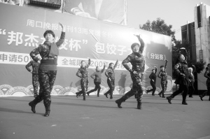 分站赛现场,大庆路阳光舞蹈队60名热心队员身着迷彩服,伴随着红歌的旋律,跳出了精彩的水兵舞(如图),为包饺子比赛增添了精彩。