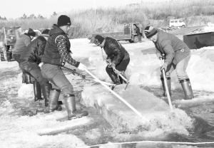 冬季来临,哈尔滨冰雪旅游进入旺季,当地采冰人开始在松花江江面上忙碌,将采集的冰块运往哈尔滨冰雪大世界等场地。新华社发