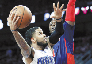 当地时间12月4日,魔术队球员奥古斯丁(左)在比赛中上篮。当日,在2016~2017赛季NBA常规赛中,底特律活塞队主场以92∶98负于奥兰多魔术队。